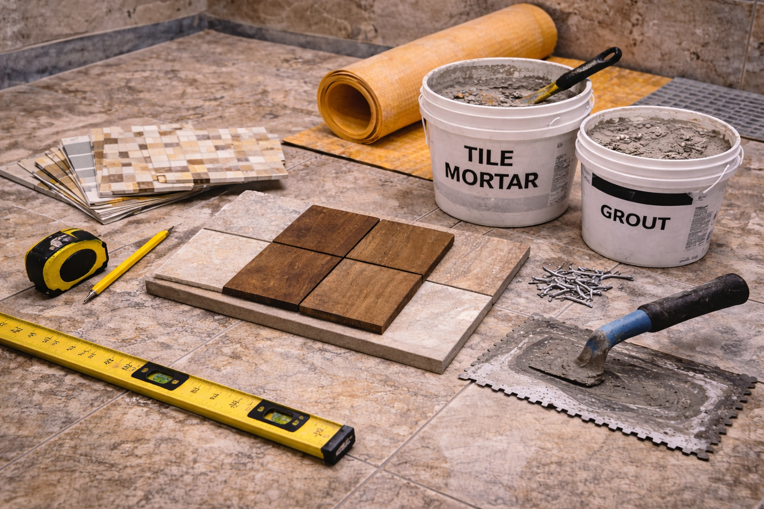 Below the surface, the remodel may need cement backer board, an uncoupling membrane, self-leveling compound, thinset mortar, grout, waterproof sealants, and transition strips. These materials matter because they support the finish floor, help control movement, and reduce the chance of cracked tile, loose edges, or water-related failure at the seams and penetrations.