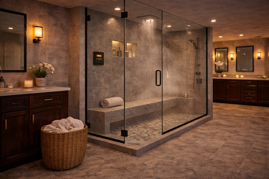 Functional upgrades often include a well-placed bench, easier-to-use controls, better enclosure sealing, and lighting that supports the steam environment safely. These upgrades matter because a steam shower has to feel comfortable and easy to use, not just technically capable of producing steam.