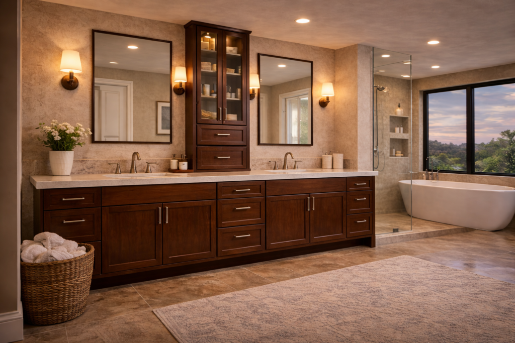 A custom double vanity makes more sense when the wall width is unusual, when stock cabinets leave wasted gaps, or when the storage needs are too specific for off-the-shelf drawer layouts. It also makes sense when the vanity wall is a major design feature in a larger primary bath remodel.