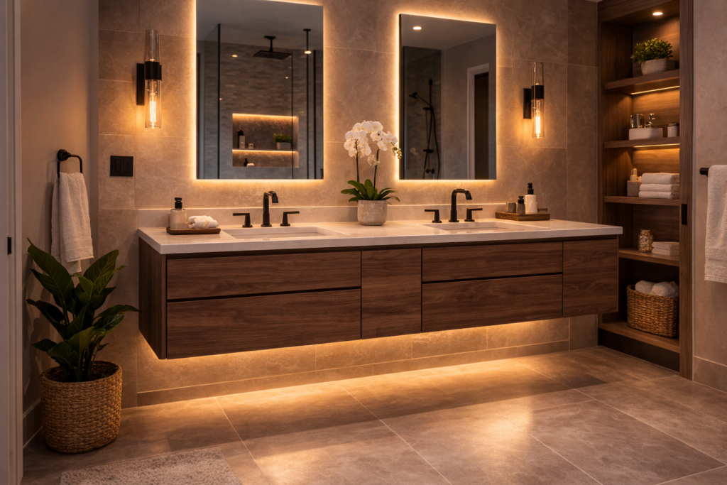 Costs usually rise with custom cabinetry, double sinks, premium countertops, under-vanity lighting, specialty finishes, stronger wall prep, and more detailed mirror and lighting upgrades. The more tailored and feature-rich the vanity becomes, the more labor and coordination it usually requires.