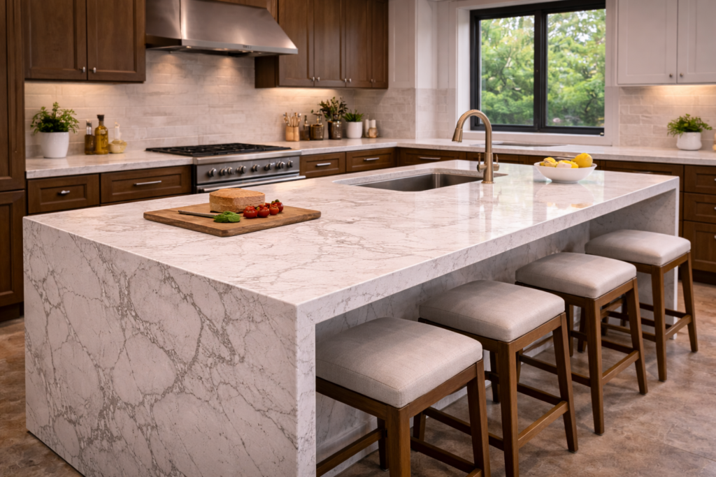Costs usually rise with premium quartz or natural stone, larger slab requirements, waterfall edges, custom sink cutouts, thicker edge details, and more elaborate backsplash coordination. The more the countertop becomes a design feature instead of a simple surface, the more the cost usually climbs.