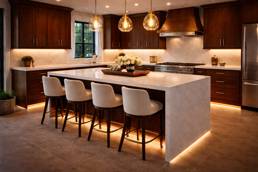 Islands are often seen from all sides, so cabinet alignment, paneling, and overhang support are very noticeable. Support matters because larger countertops and seating areas may need reinforcement that should not feel temporary or exposed.