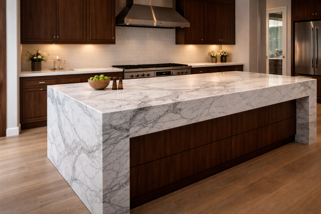 Premium slabs, double waterfalls, large islands, complex veining layouts, thicker edges, and difficult installations usually raise cost the most. Waste can also increase cost because waterfall pieces may require more slab area than a standard island top.