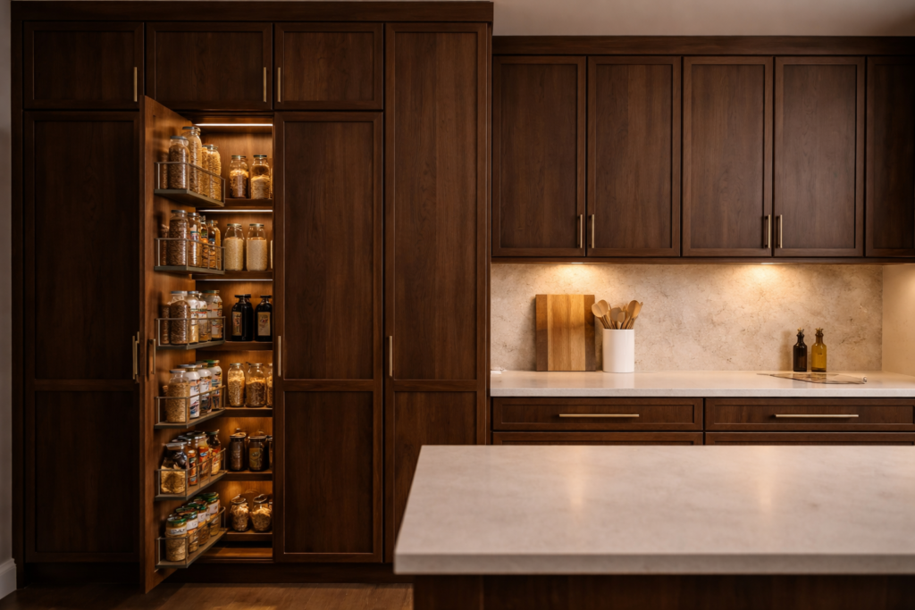 Tall pantry cabinets are common because they give substantial closed storage without needing a separate room. Pull-out pantry systems are common when access is more important than raw shelf count. Walk-in pantries are common when the kitchen has the square footage to support a larger dedicated storage zone.